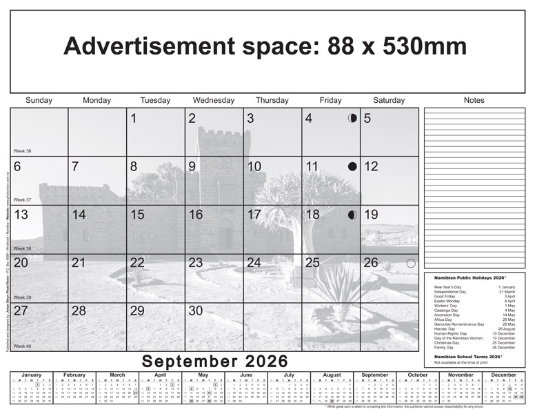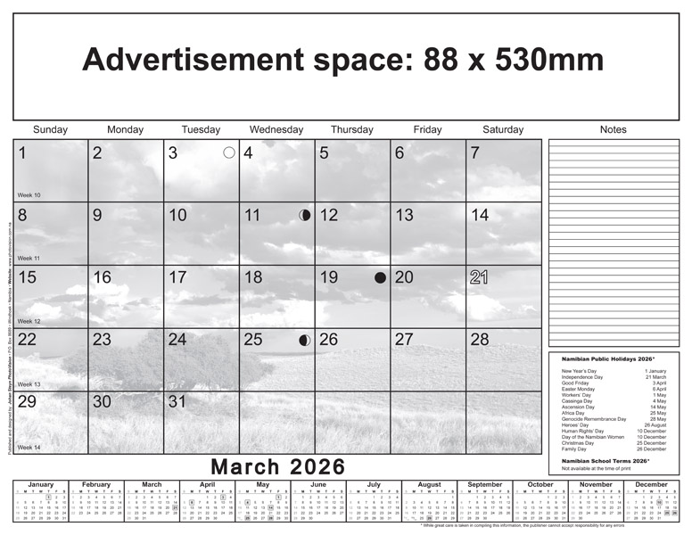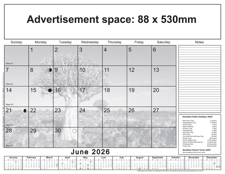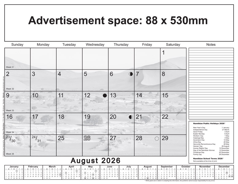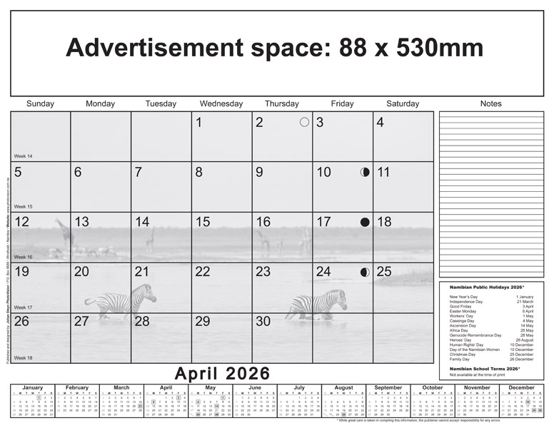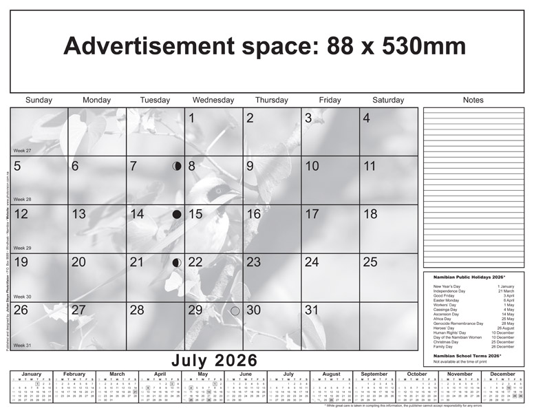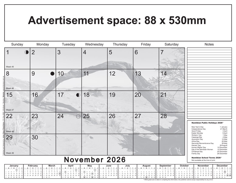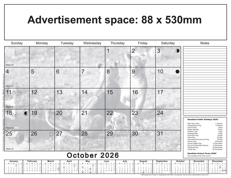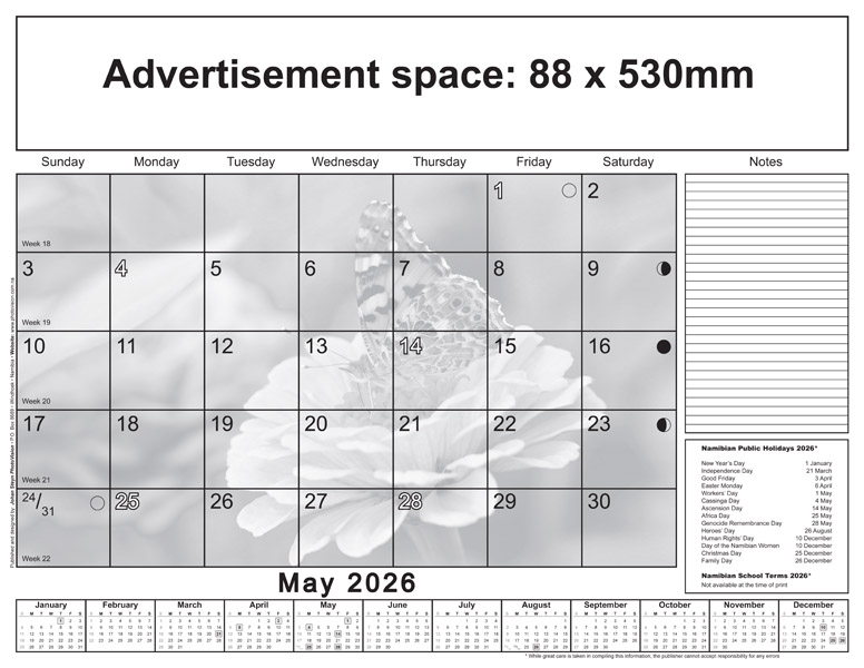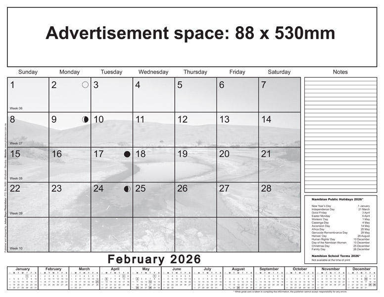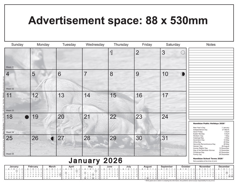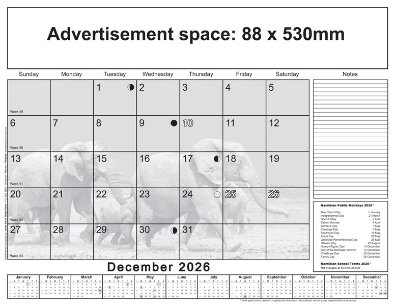* Please note: Only Namibian national holidays are indicated on the calendarium.